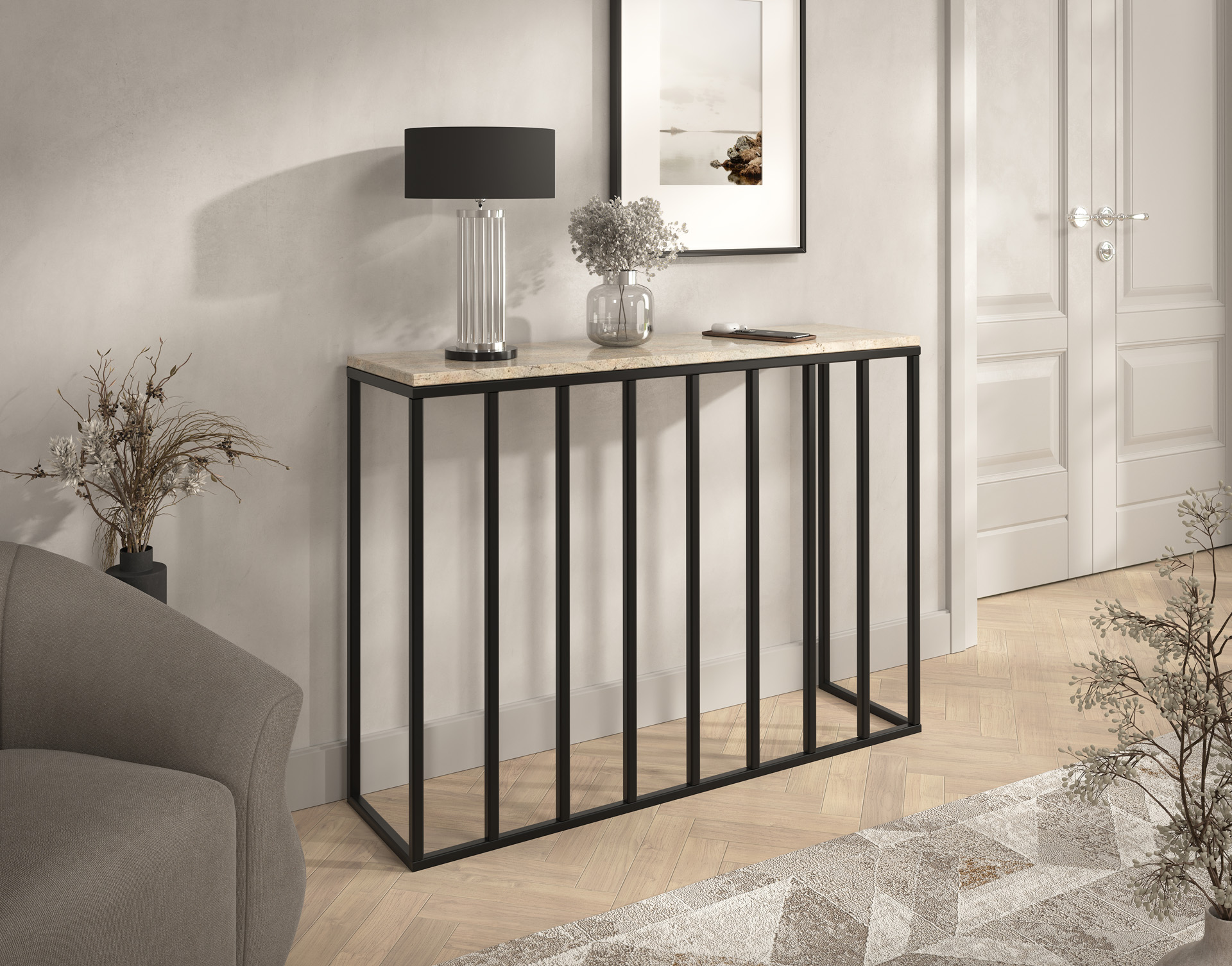 Nowoczesna konsola wykonana w stylu Skandynawskim ma bardzo industrialny i minimalistyczny charakter dzięki prostym, pionowym prętom tworzącym ramę. Blat kamienny położony na solidnej konstrukcji. Jednocześnie podstawa wykonana z delikatnego profila co nadaje jej lekkości.