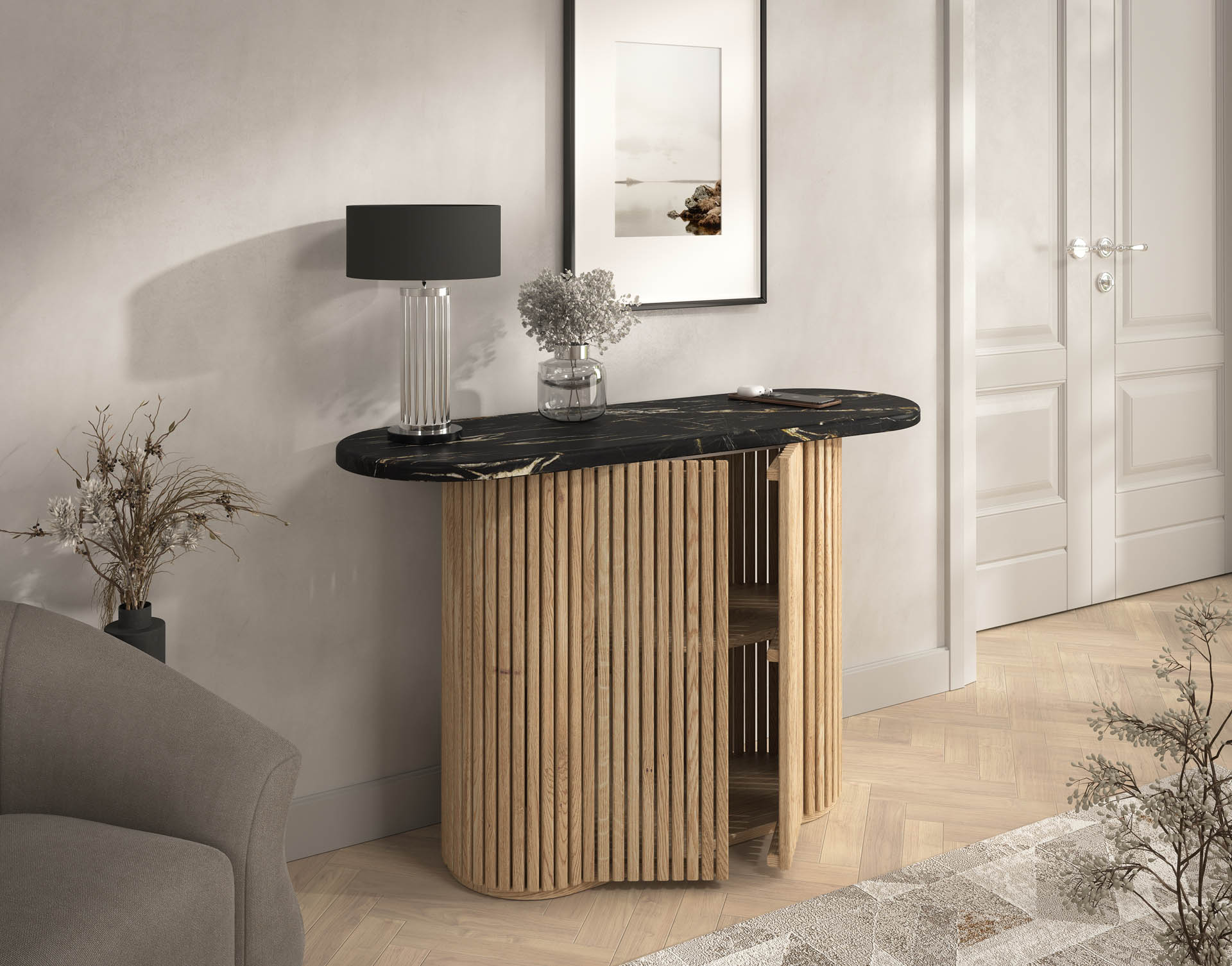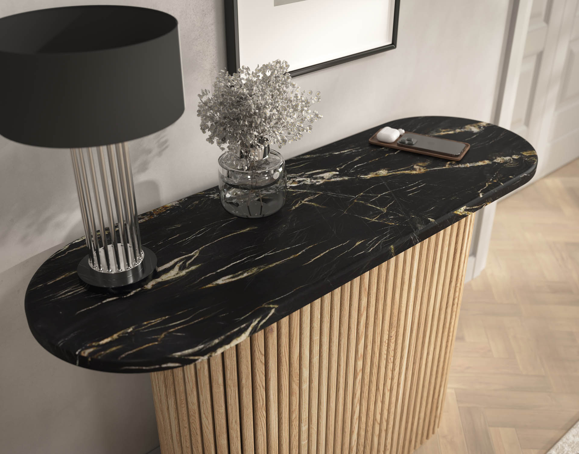 Wszystkie elementy konstrukcyjne są z drewna litego lub klejonego. Cięte, obrabiane i malowane w Polsce. Używamy do tego specjalistycznego sprzętu jak piły CNC, frezarki i obrabiarki. Używamy dobrej jakości suchego drewna aby konstrukcja była solidna i stabilna. To nie są chińskie podstawy zamawiane na masową skalę.