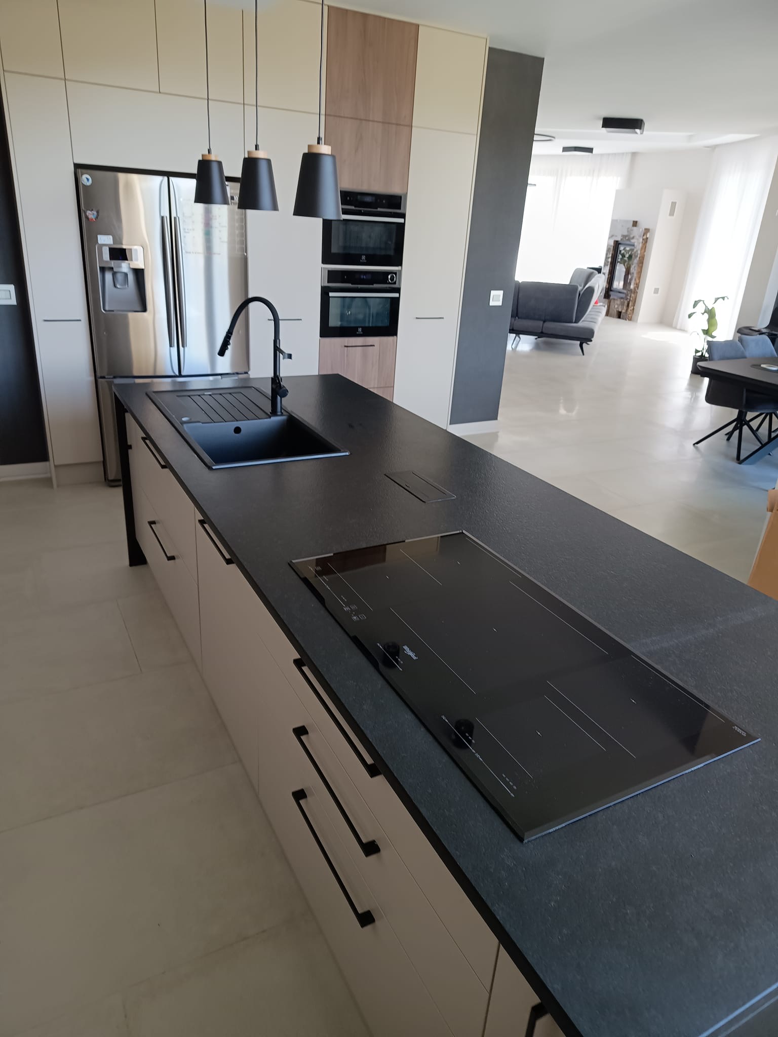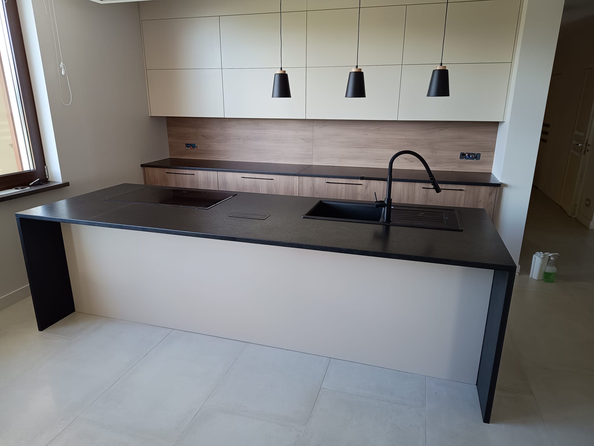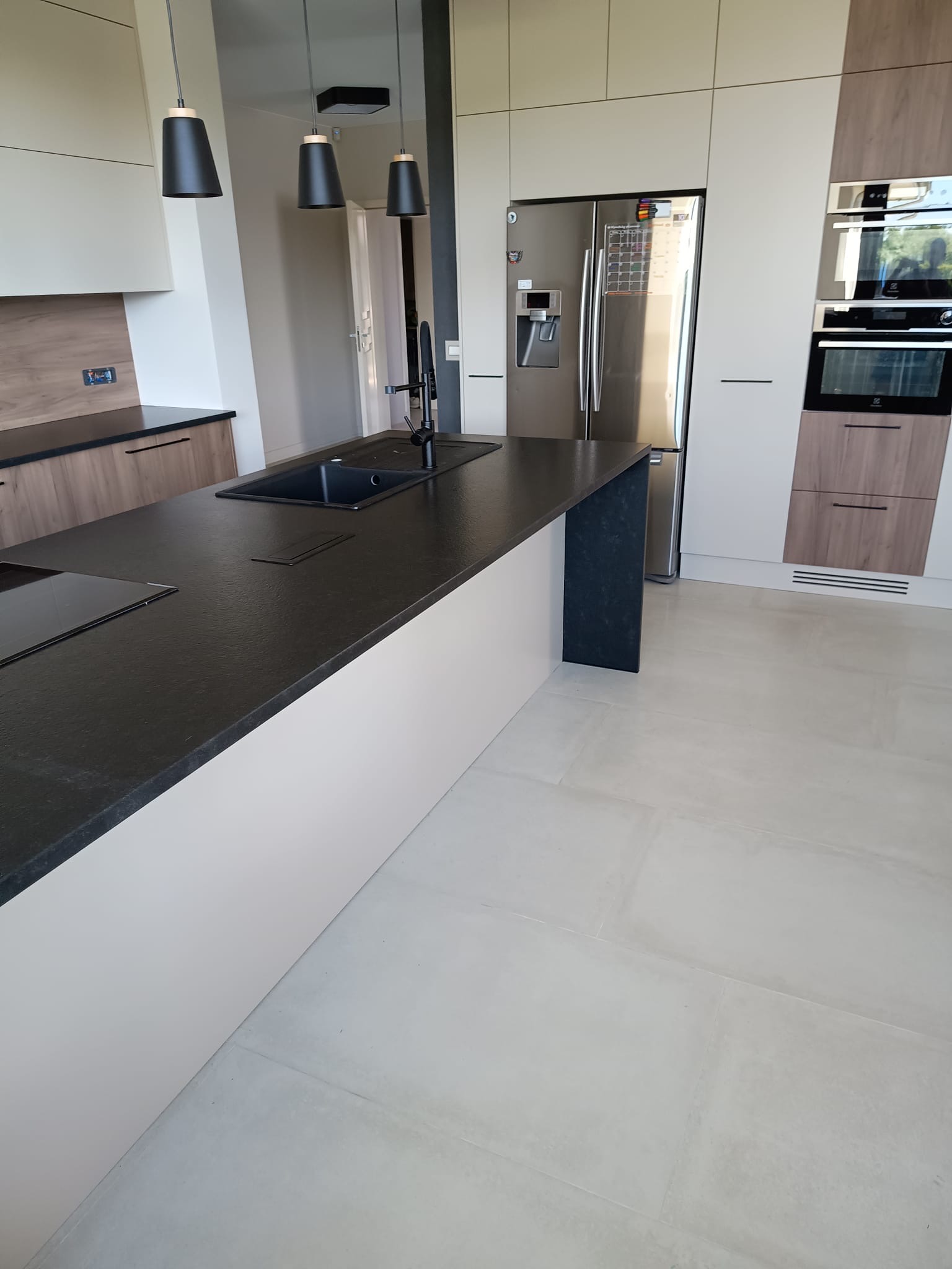 Nowoczesna kuchnia zaprojektowana z myślą o funkcjonalności, ergonomii i trwałości materiałów. Centralnym elementem aranżacji są