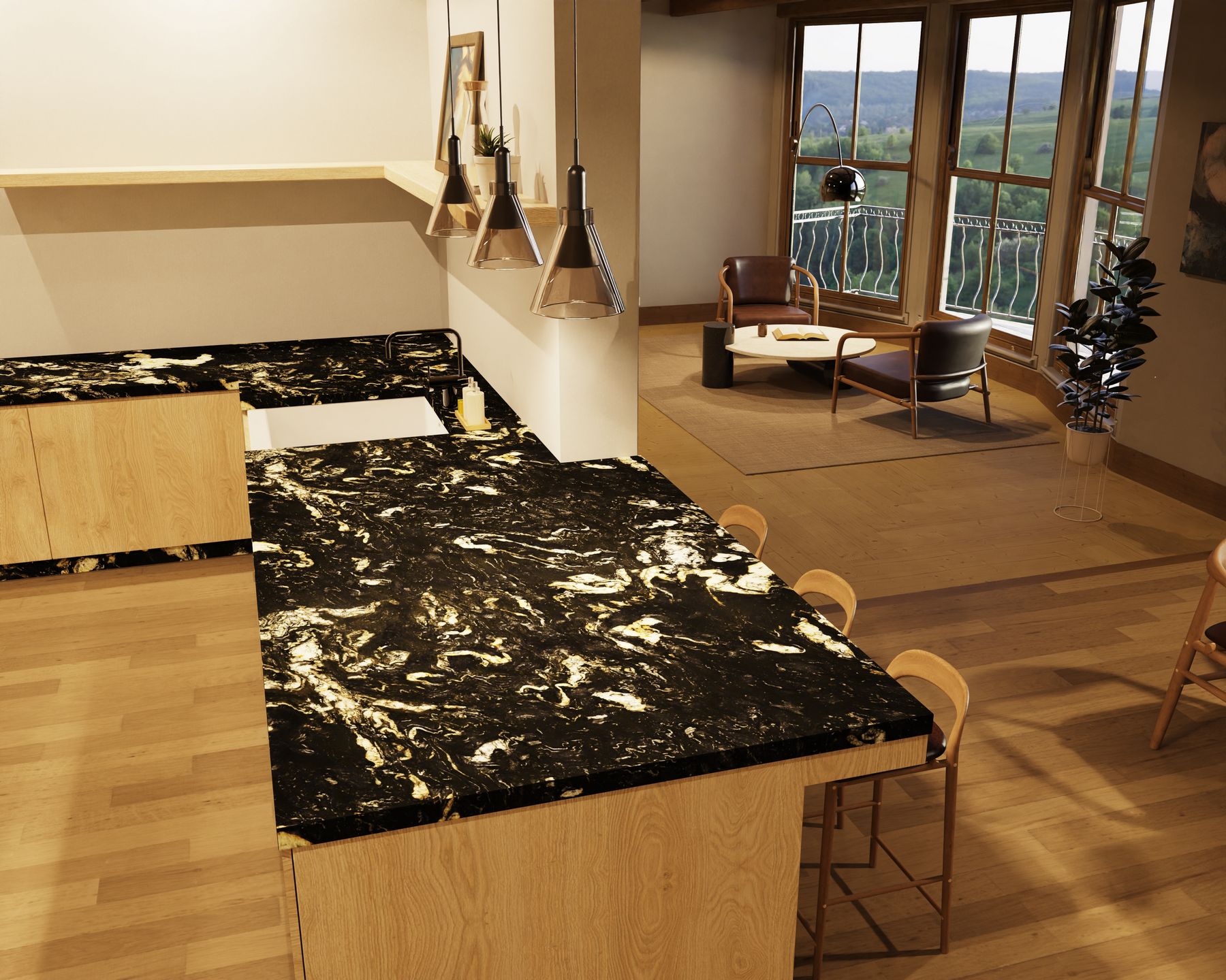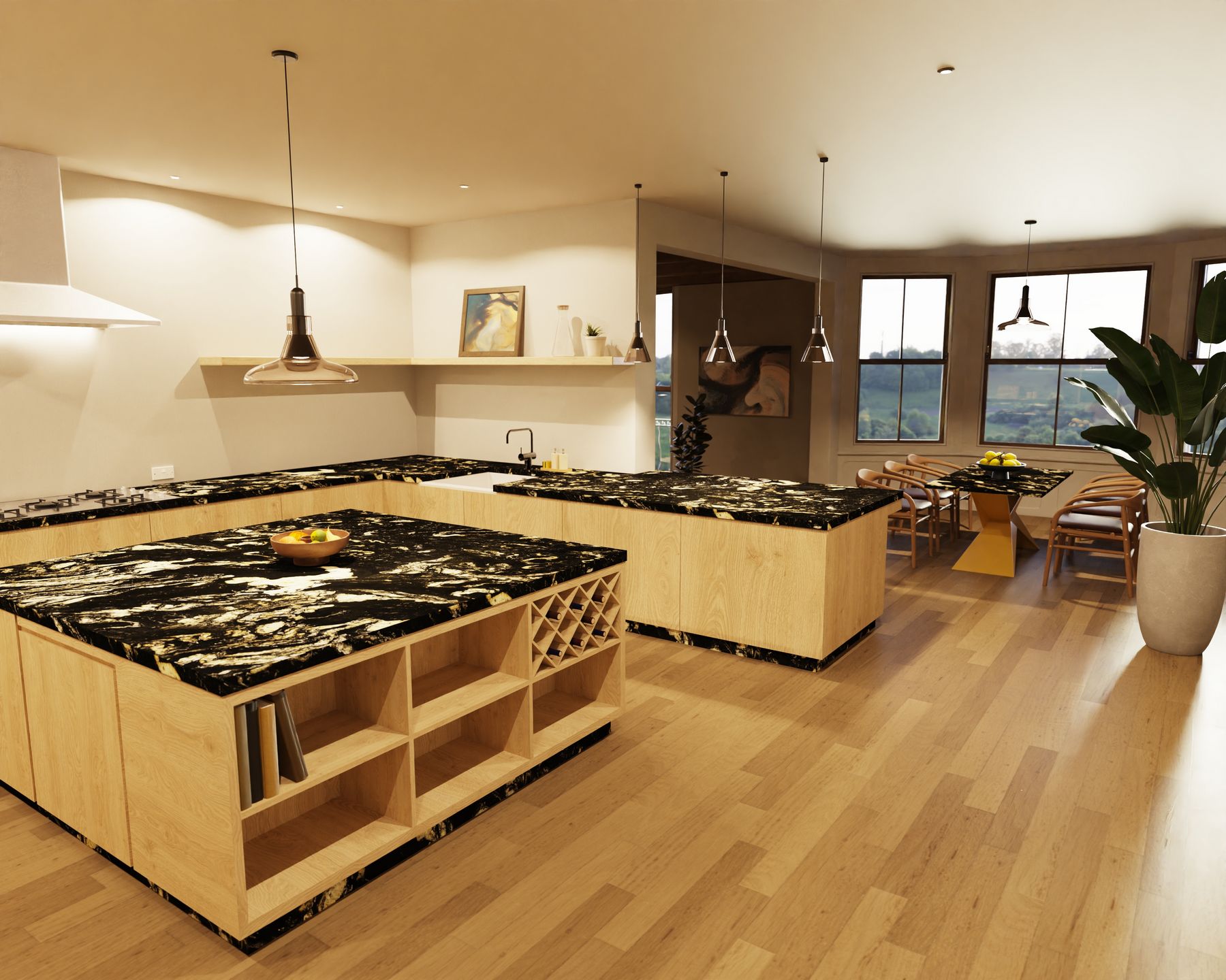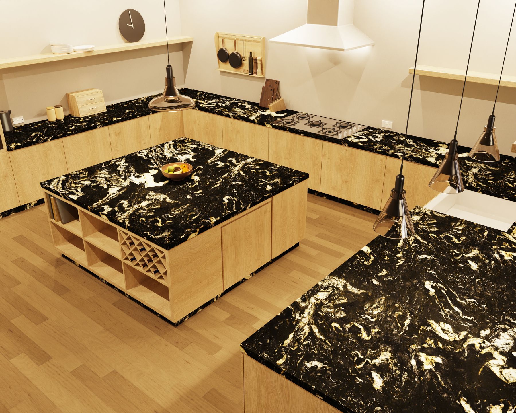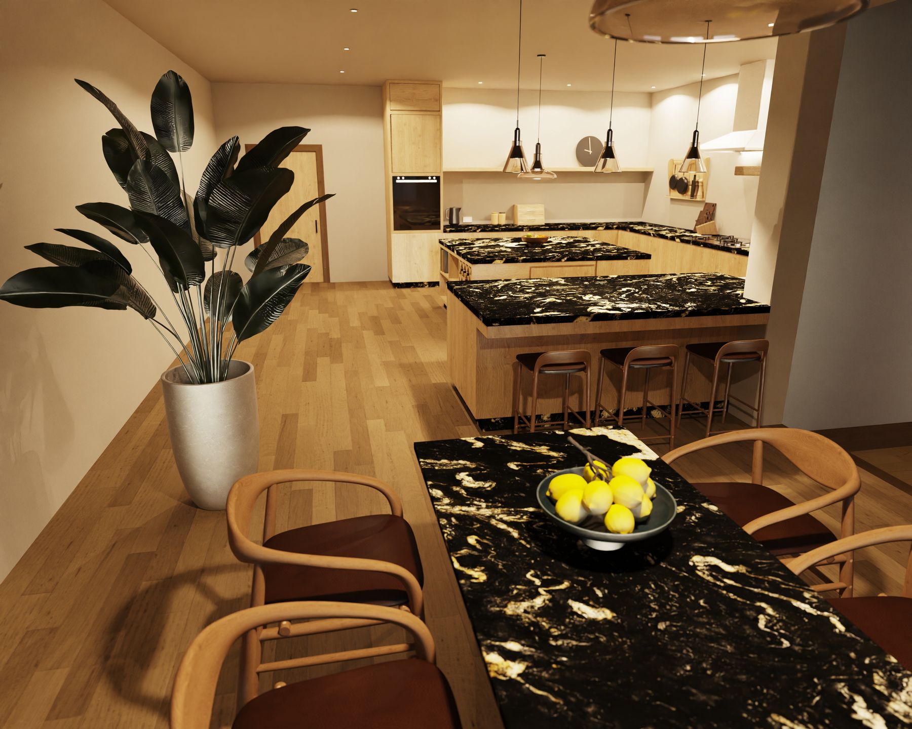 Propozycja nowoczesnej kuchni zaprojektowanej z myślą o wygodzie użytkowania i eleganckiej, ponadczasowej estetyce. Centralnym elementem aranżacji są blaty kamienne, które wyróżniają się wysoką odpornością na temperaturę, zarysowania oraz intensywne użytkowanie. Dzięki zastosowaniu naturalnego materiału powstała funkcjonalna kuchnia z blatami kamiennymi, idealna zarówno do codziennego gotowania, jak i spotkań przy wyspie kuchennej. Kamień na blaty podkreśla prestiżowy charakter zabudowy oraz gwarantuje trwałość na długie lata. Ergonomiczny układ szafek i wyspy sprawia, że ta nowoczesna kuchnia łączy styl, wygodę i praktyczne rozwiązania.