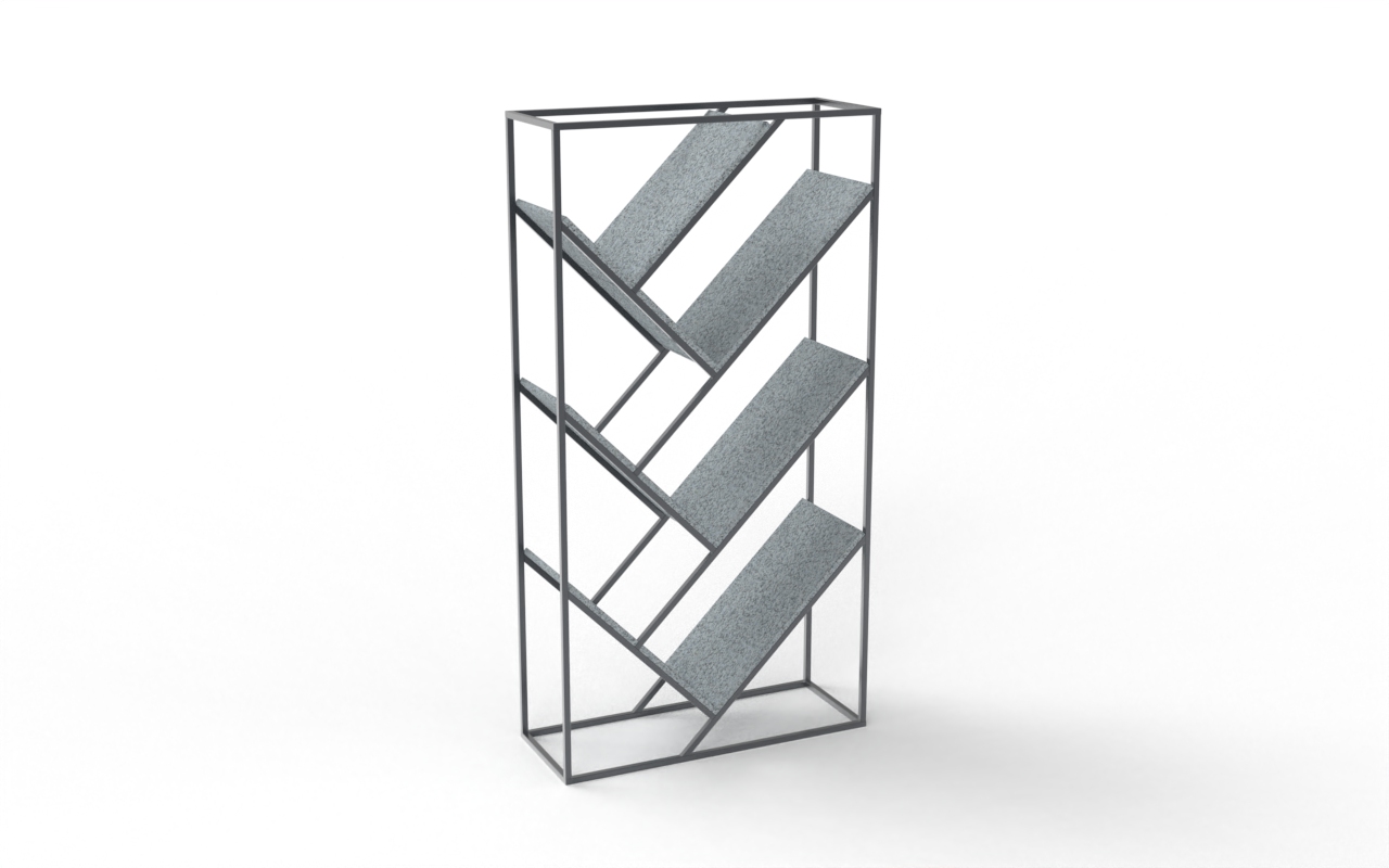 Nowoczesny regał Slope to połączenie minimalizmu i oryginalnego designu. Jego konstrukcja opiera się na geometrycznej stalowej ramie, w której osadzone są półki ułożone pod kątem, tworzące efektowny wzór w kształcie litery „V”.