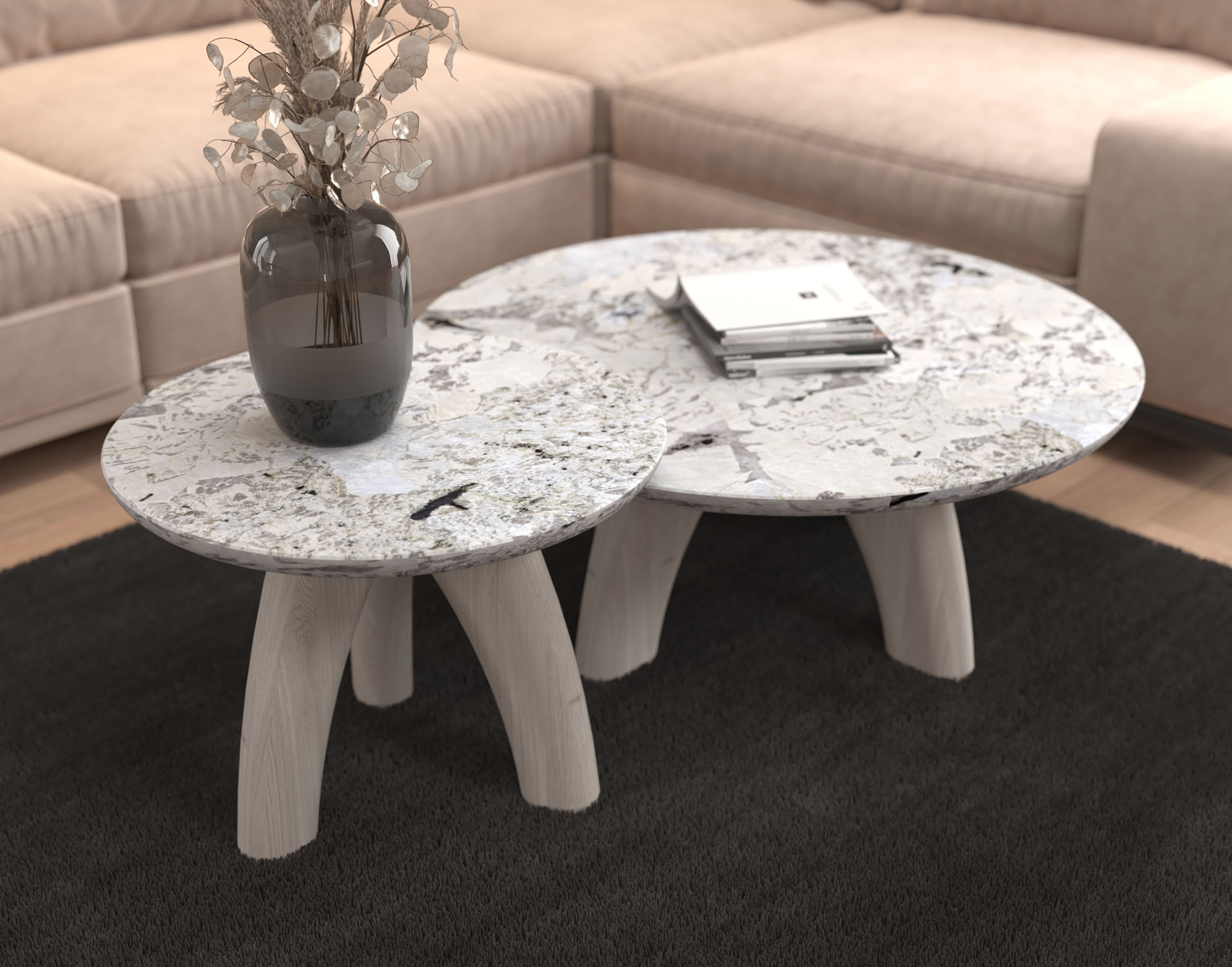 Ten zestaw designerskich stolików kawowych wyróżnia się organiczną, harmonijną formą, w której funkcjonalność spotyka się z estetyką inspirowaną naturalnymi kształtami. Okrągłe, kamienne blaty nadają kompozycji elegancję i ponadczasowy charakter, a ich miękkie linie podkreślają subtelność całego projektu.