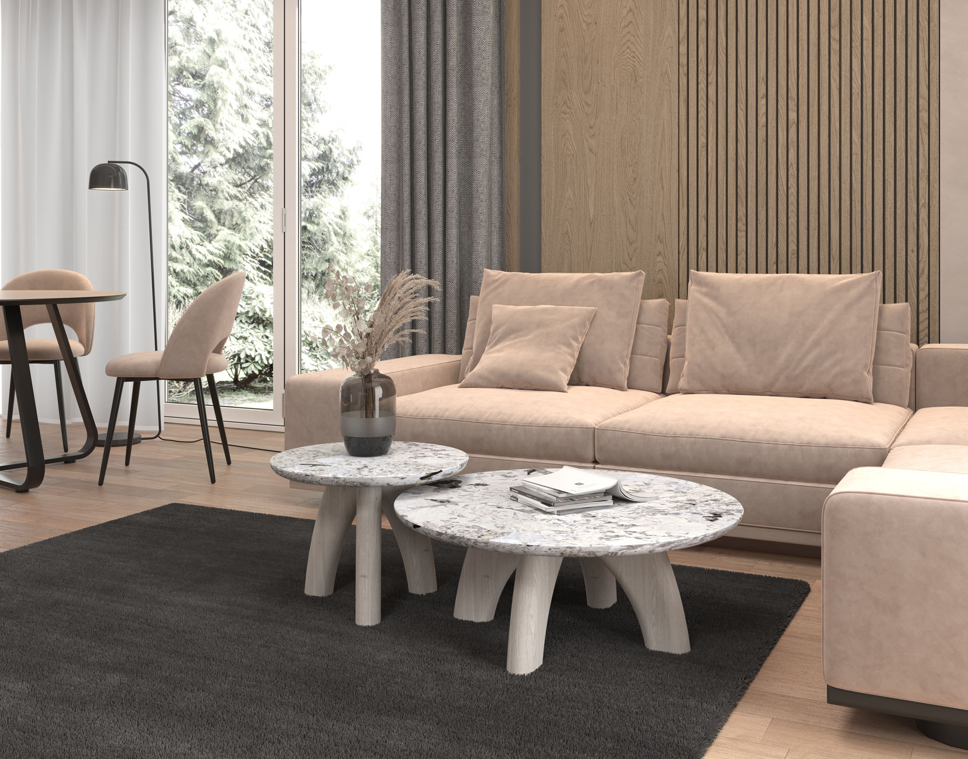 Dwa stoliki o różnej wysokości pozwalają na tworzenie funkcjonalnych aranżacji – można je ustawić razem jako zestaw lub użyć oddzielnie w różnych częściach pomieszczenia. Asymetryczne zestawienie podkreśla nowoczesny charakter projektu i sprawia, że świetnie wpisuje się on we wnętrza w stylu modern, organic modern, japandi czy luksusowe aranżacje minimalistyczne.