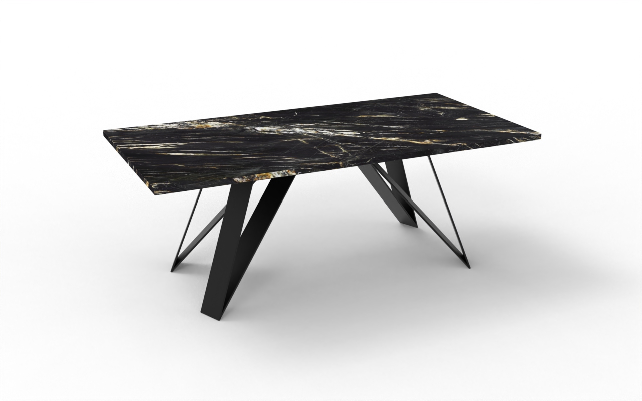 Konstrukcja stołu wsparta jest na solidnych, metalowych nogach, które mogą być malowane w różnych kolorach, ułożonych pod skosem w geometrycznej, asymetrycznej formie. Nogi tworzą dynamiczną, rzeźbiarską podstawę, co dodaje całości nowoczesności i lekko futurystycznego stylu.