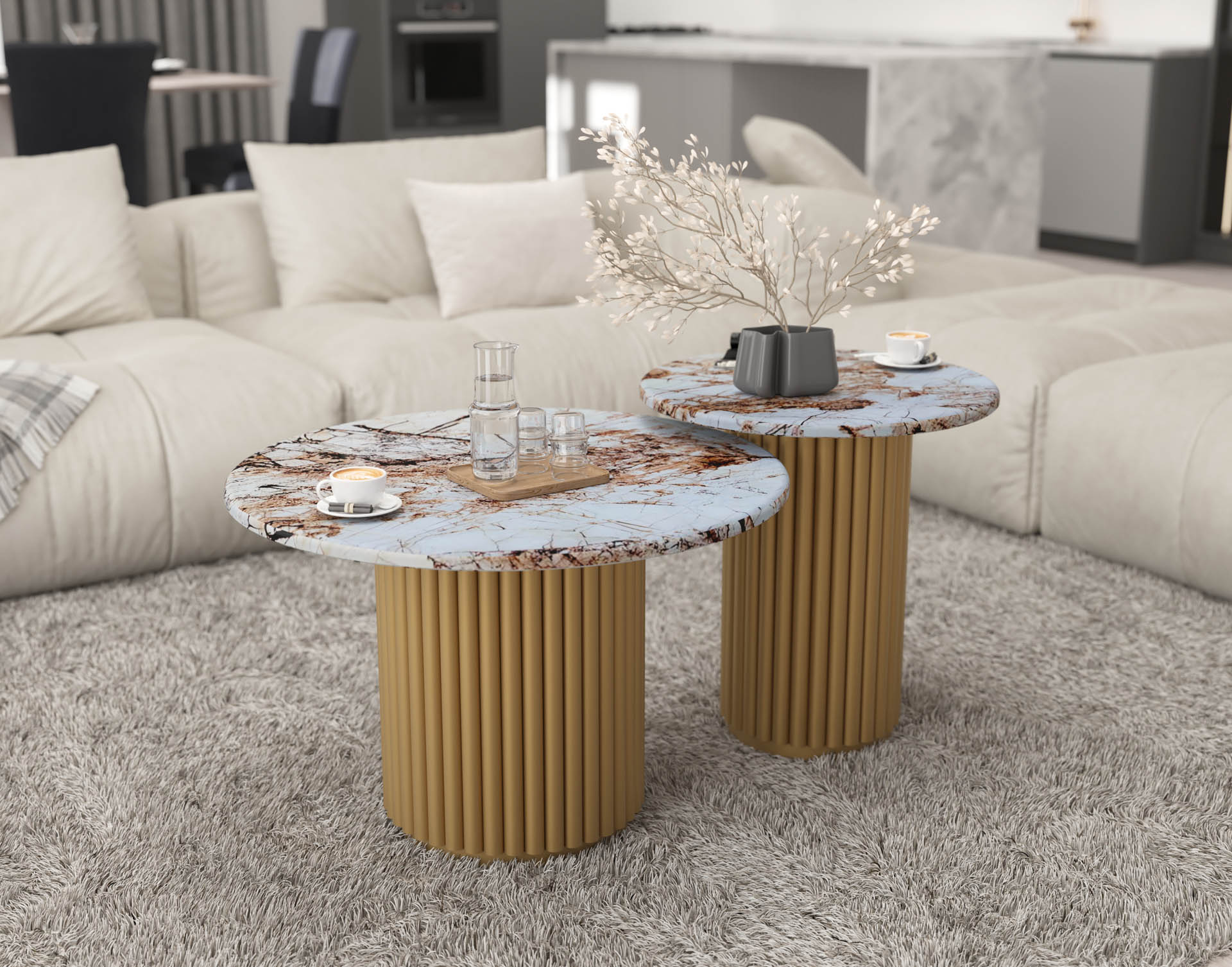 Stolik TANGO to wyjątkowe połączenie nowoczesnego designu i ponadczasowej elegancji. Jego blat pokryty naturalnym kamieniem wprowadza do wnętrza luksus i trwałość, a solidna metalowa podstawa o pionowym ryflowaniu nadaje całości charakteru i stabilności. Subtelna gra proporcji i zrównoważona forma sprawiają, że stolik doskonale prezentuje się zarówno solo, jak i w duecie z mniejszym odpowiednikiem.