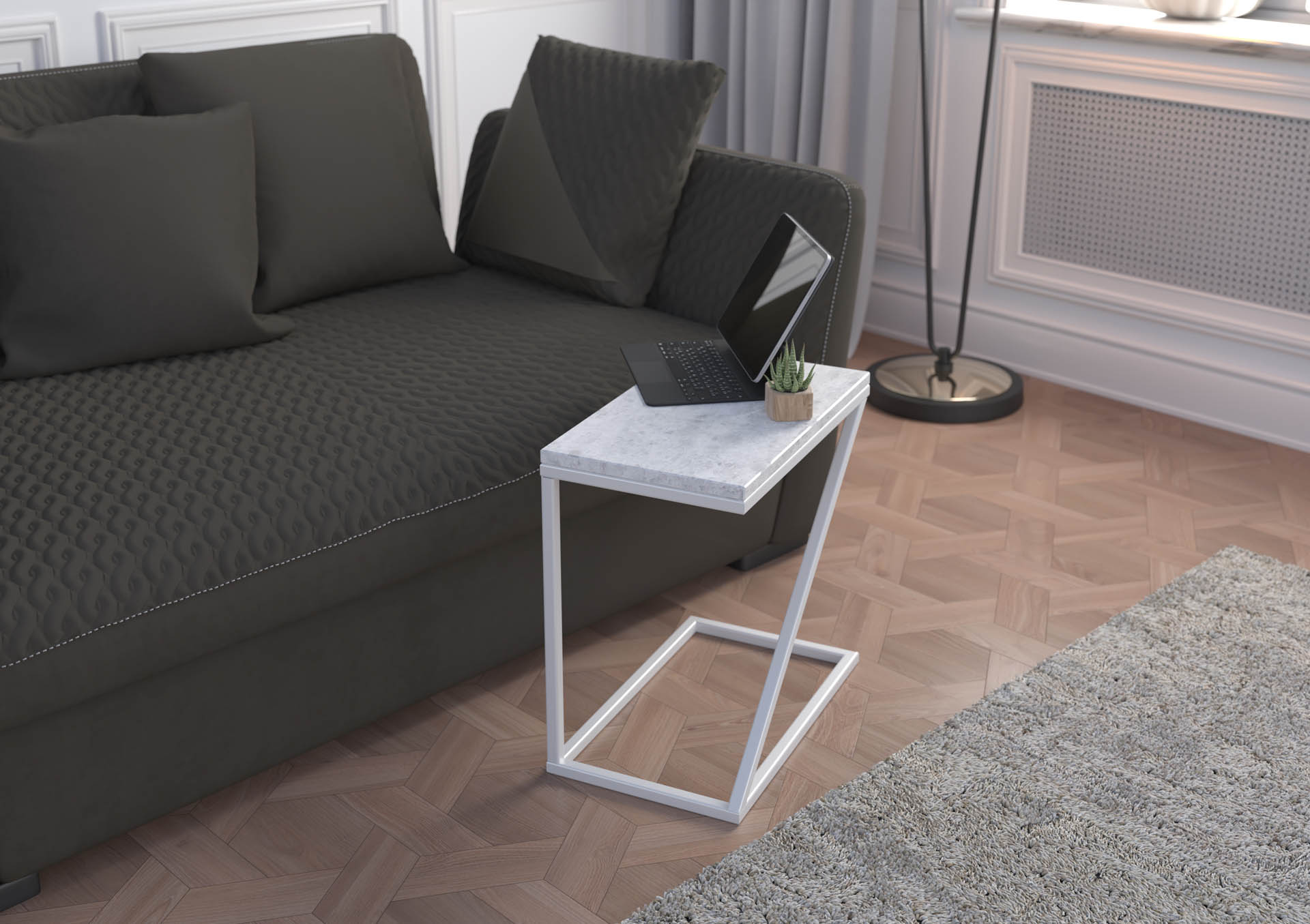 Stolik pomocniczy z dynamiczną, nowoczesną formą typu „Z”. Może służyć również jako stolik nocny. Wyrazisty design – dynamiczna forma stelaża i kamieny blat nadają temu stolikowi energiczny, nowoczesny charakter. Lekka konstrukcja – optycznie nie zajmuje dużo miejsca, więc sprawdzi się w mniejszych wnętrzach.