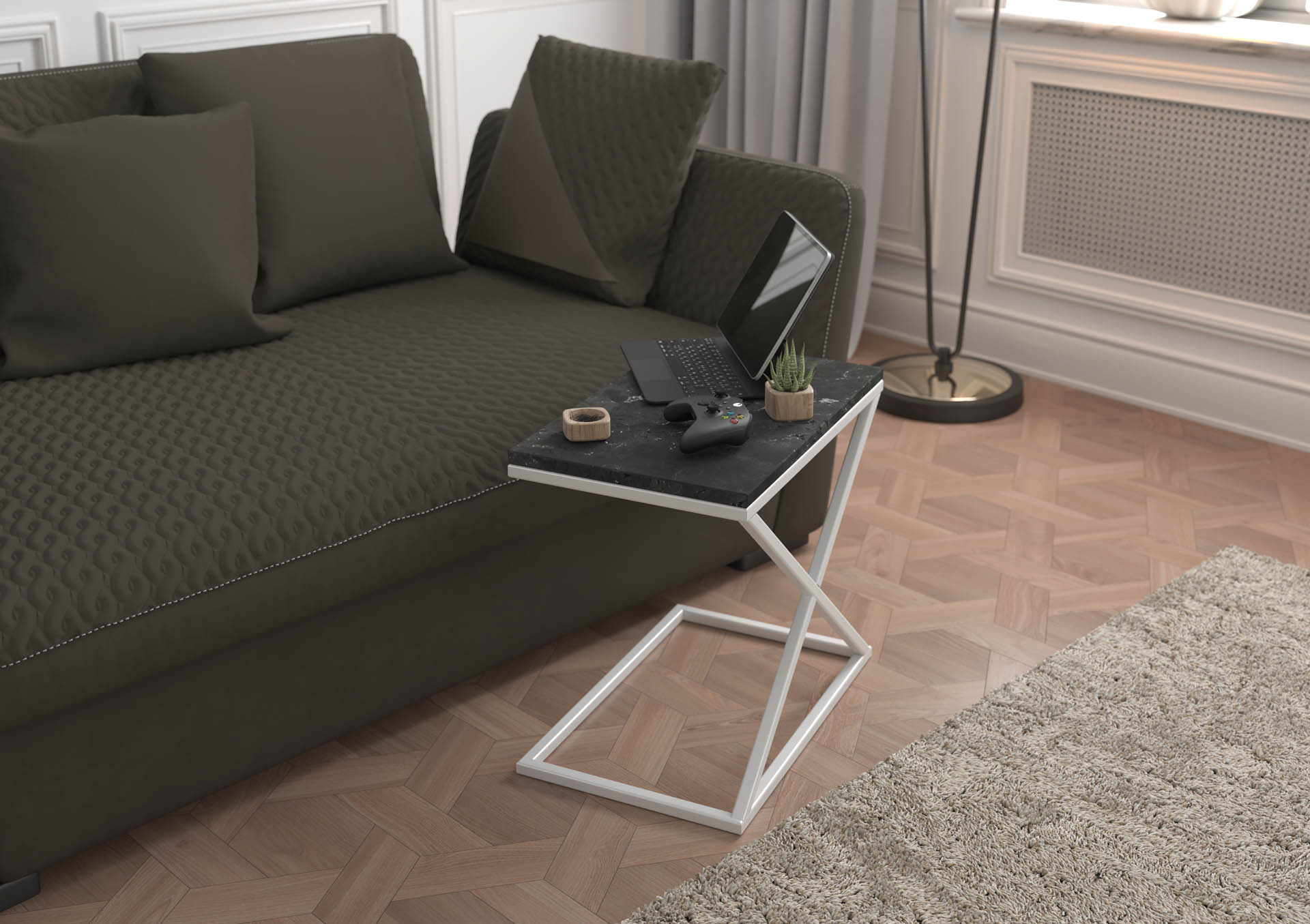Ten stolik pomocniczy ma bardzo ciekawy, nietypowy design. Może też służyć jako szafka nocna. Konstrukcja jest odważniejsza wizualnie, przyciąga uwagę i nadaje meblowi charakteru. Idealny jako pomocniczy stolik przy kanapie lub łóżku — na laptopa, kubek lub książkę.